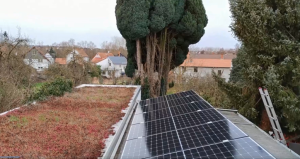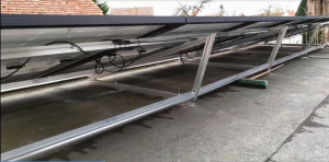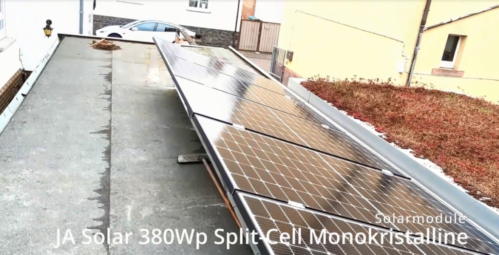 Bisher lagerten auf der Garage alte Holzreste. Dadurch litt auch das Flachdach der Garage. Nach der Errichtung einer aufgeständerten Solaranlage trocknete das Dach gut ab und erzeugt ganz nebenbei seinen Beitrag zur Energiewende.